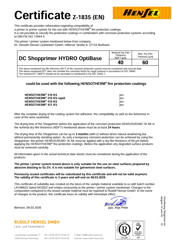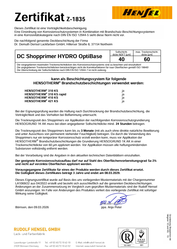 Prüfbericht Brandschutz DC Shopprimer HYDRO OptiBase_40µm
